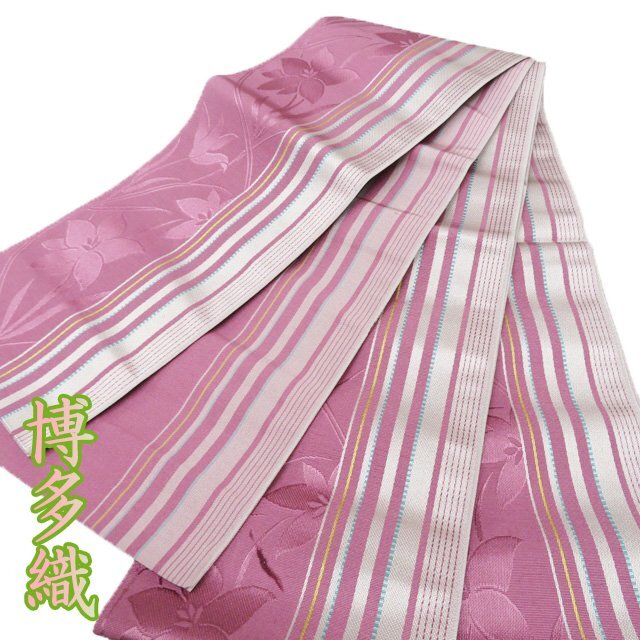 - 半幅帯 未使用 正絹 カジュアル 未仕立て 全通 博多織 ラベル付き 花模様 浅蘇芳色 多色 きもの北條 A1181-12