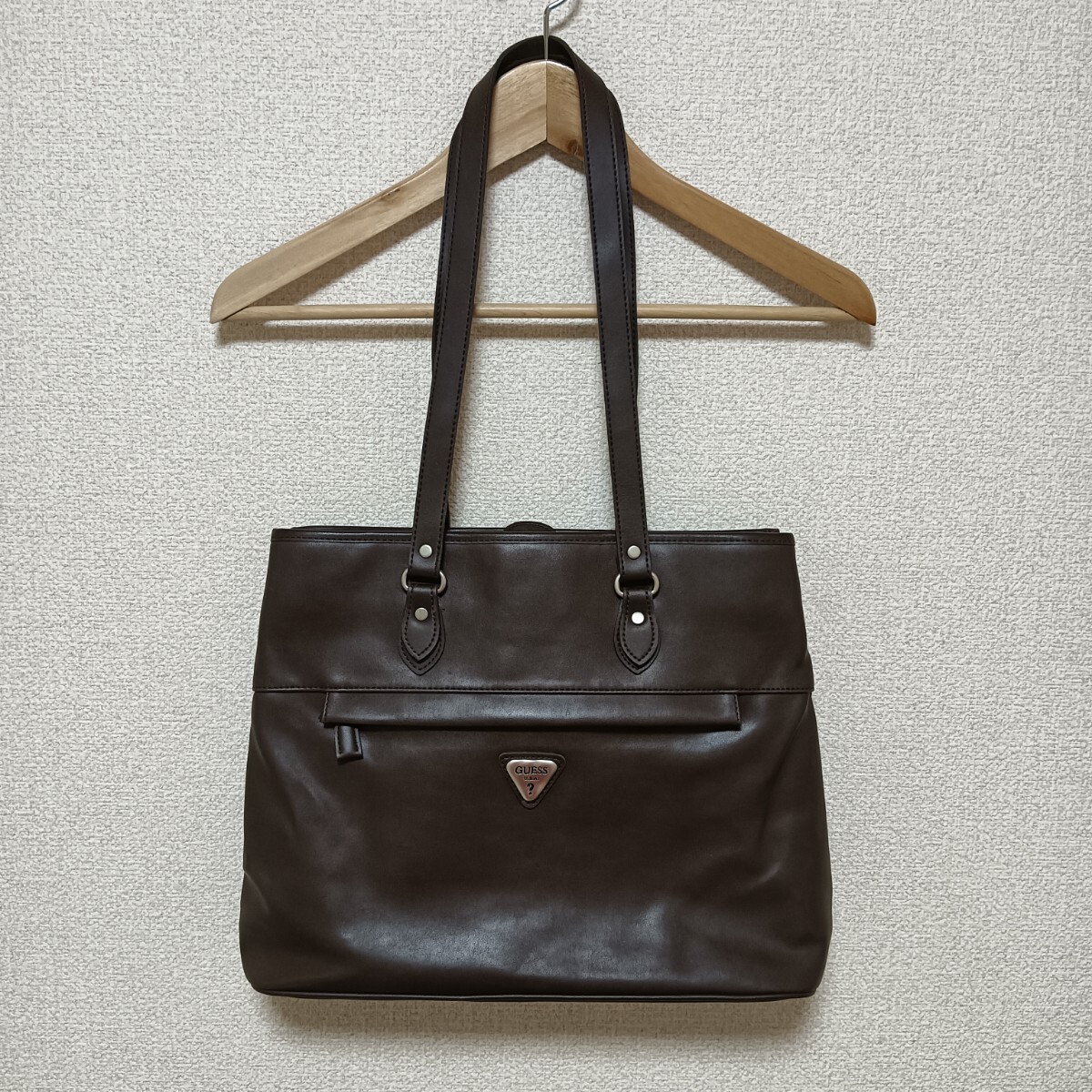 > 美品☆GUESS U.S.A. ゲス トートバッグ プレートロゴ 本革 レザー ブラウン 茶 アーカイブ 手提げ 肩掛け 鞄 アクセサリー 希少 古着 USED