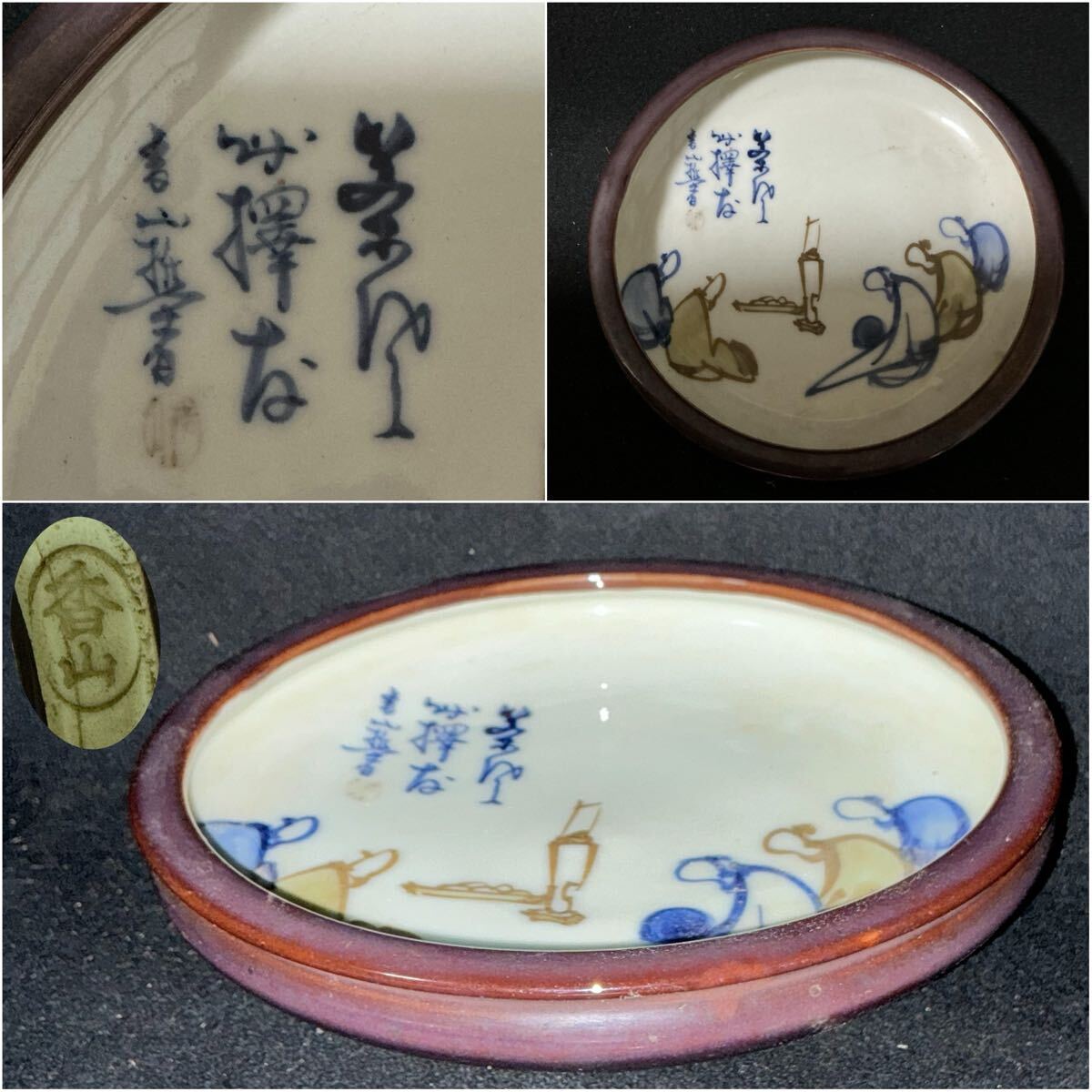 - 真葛香山 辰砂涼炉図鉢 水盤 砂鉢 宮川香山 漢詩 人物図 飾り鉢 京焼