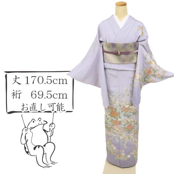 - 【付下げ】 長尺 豪華 『汕頭刺繍』 地紙に牡丹花々 藤色 袷正絹着物 SP11-7
