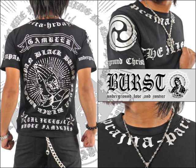 - BURST JAPAN イリーガルプリント&三つ巴&スカル合掌プリント半袖Tシャツ 70537 新品 ブラック×シルバー M