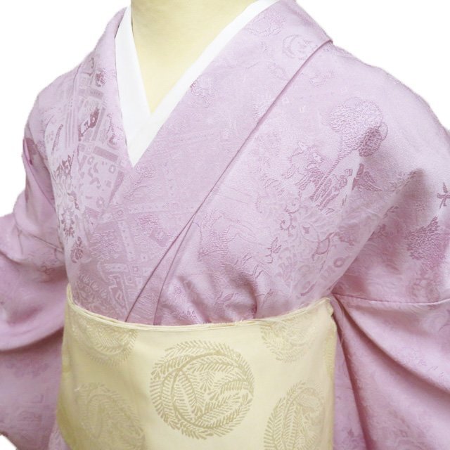 > 色無地 着物 中古 正絹 袷 カジュアル 紋なし 地模様 風景 人物 動物 淡紅藤色 身丈170cm 裄70cm L トール きもの北條 A1182-5