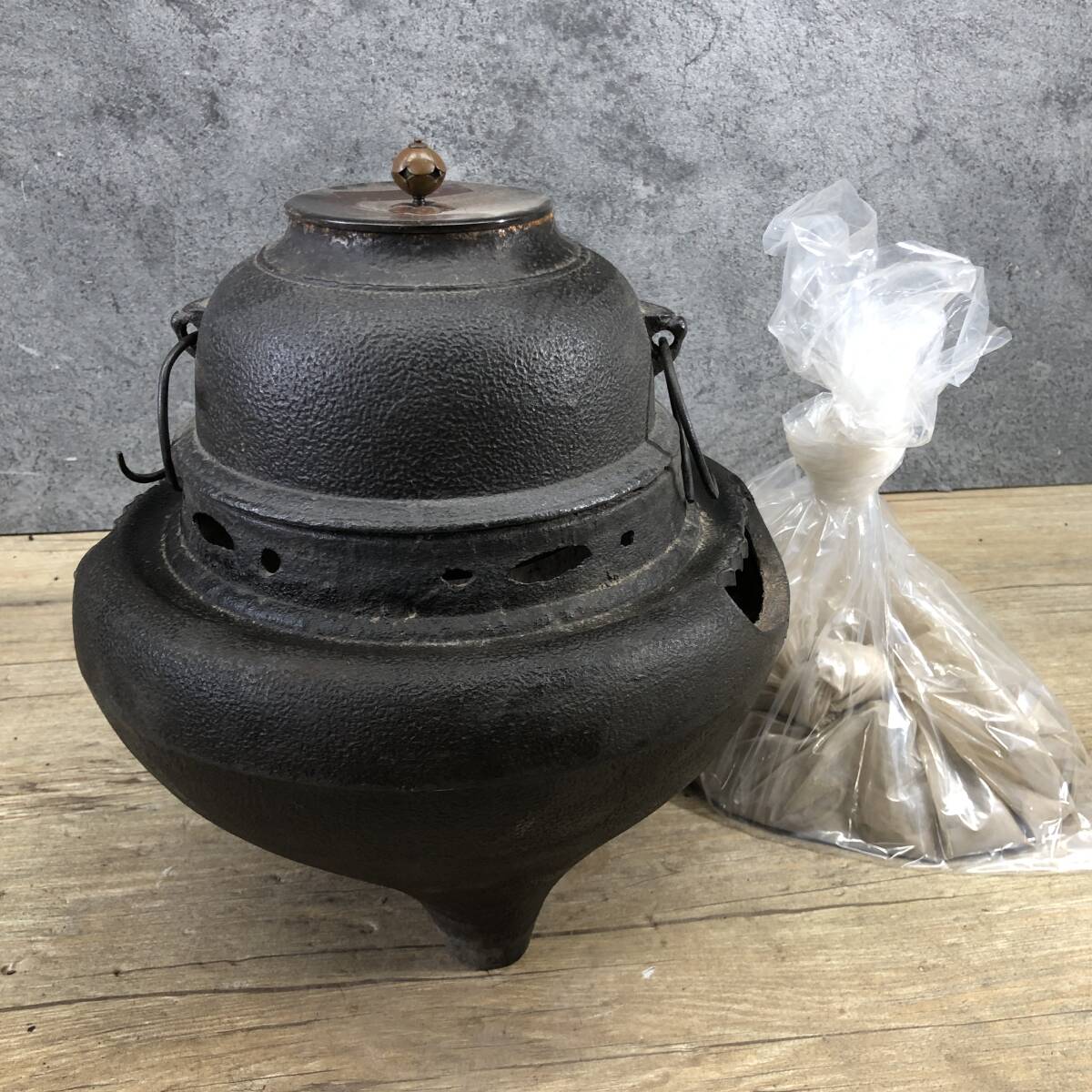 - 茶釜 鬼面風炉釜 灰 柚肌 三脚 銅蓋 一文字蓋 茶道具 茶器 煎茶道具 25d菊E