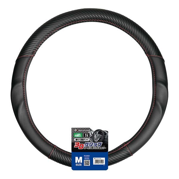 > ハンドルカバー Mサイズ 普通車 ミニバン 1BOX アーバンカーボン 3D グリップ 細巻 カーボン調 素材 黒レザー コンビ 赤 ステッチ 送料無料