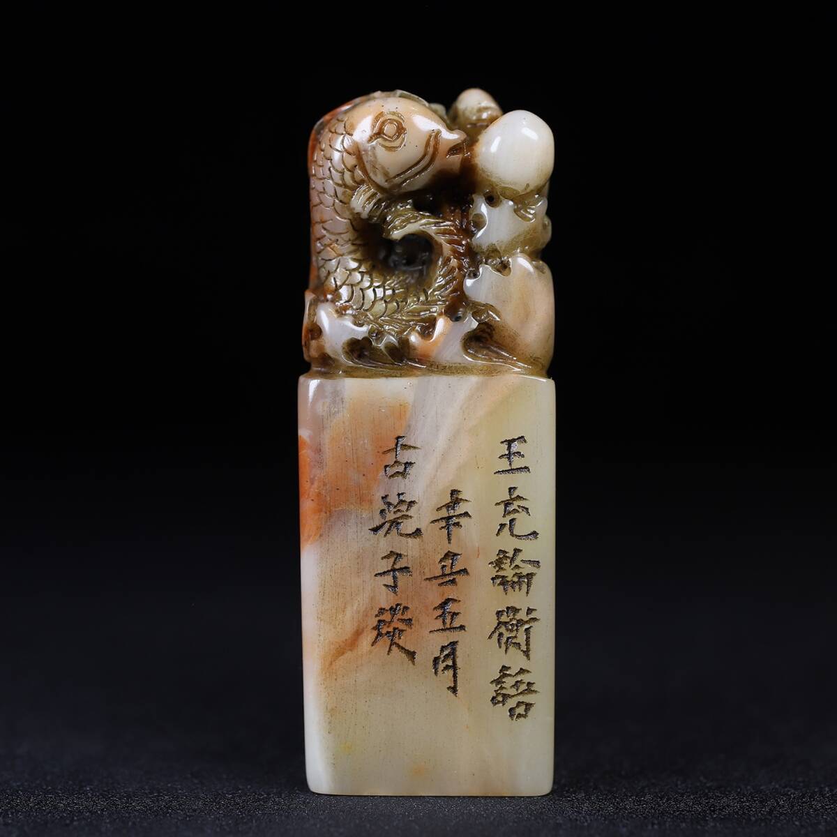 - 唐物 【清代篆刻家 鄧石如 號:古浣子】寿山石 《連年有餘》蓮花魚 印鑑 天然石 手彫 篆刻 古印材 極細工 中国美術品 中国古玩 骨董品 D64