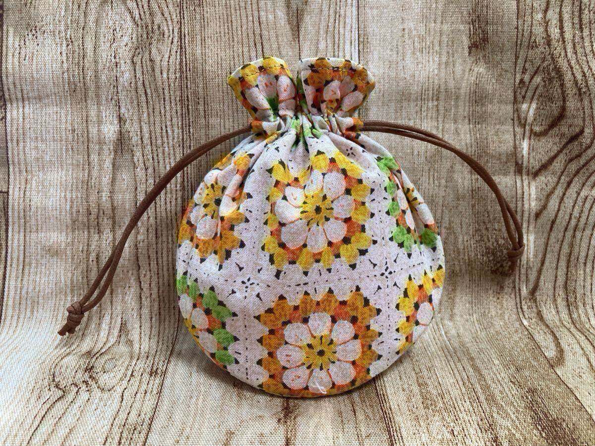 - 巾着袋 巾着 編み物モチーフつなぎプリント 丸底 ハンドメイド ミニ巾着