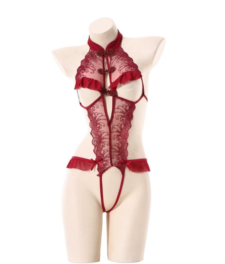 - 新品●オープンクロッチ ランジェリー レディース レース刺繍インナーウエア●コスプレチャイナドレス風 大人ボーディスーツ 美胸 エロかわ