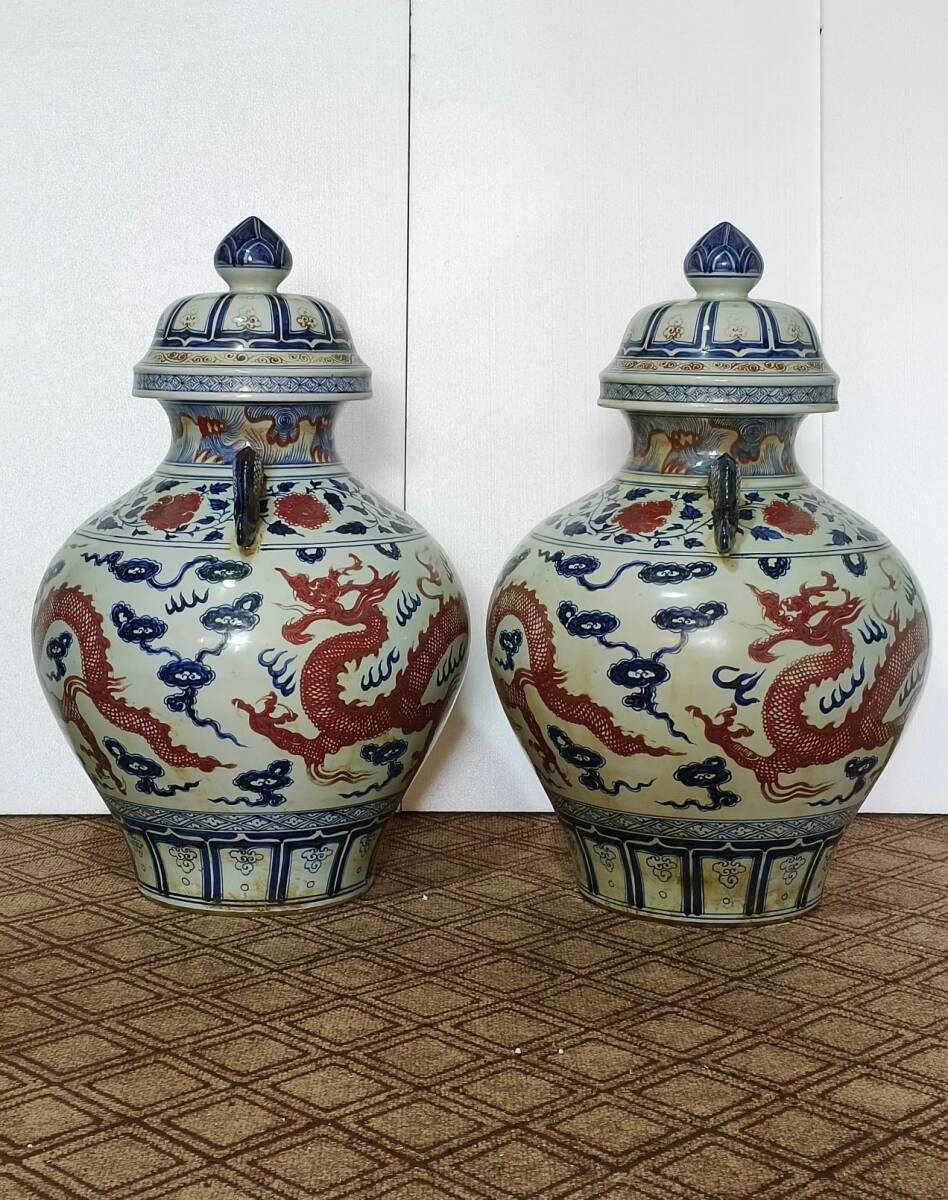 > 多宝閣 ■ 201284 中国磁器 中国骨董【魚の耳と蓋が付いた青白釉下赤龍文壺一組】工芸品 施釉陶 陶芸 置物 收藏品 孤品