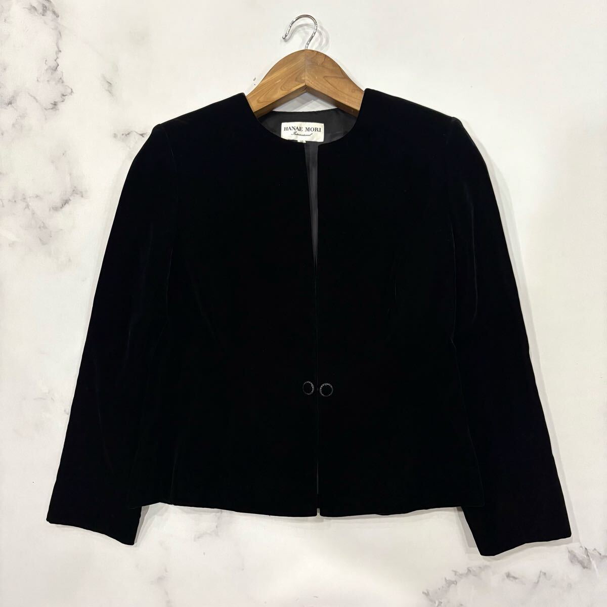 - H ■ 良品 '日本製' 洗練されたデザイン HANAE MORI ハナエモリ 高品質 ベルベット ノーカラー ジャケット SIZE:38 レディース 婦人服