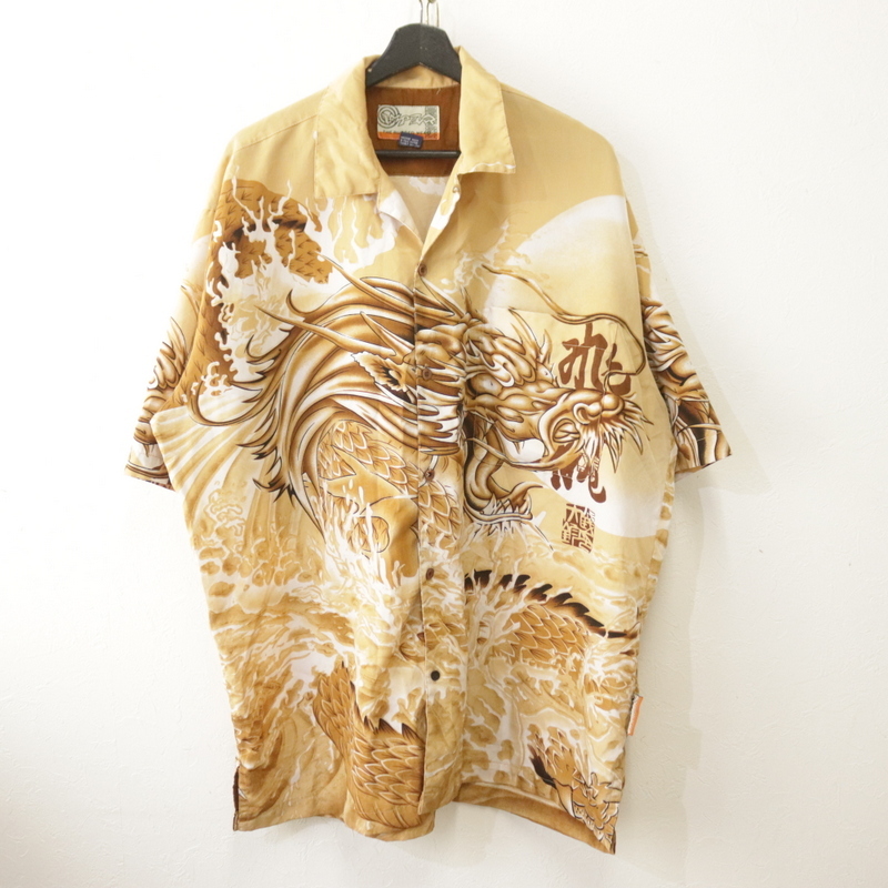 > F463 2000年代製 半袖チカーノシャツ■00s 表記XLサイズ ブラウン オープンカラー ドラゴン アメカジ ストリート 古着 激安 希少 90s 80s
