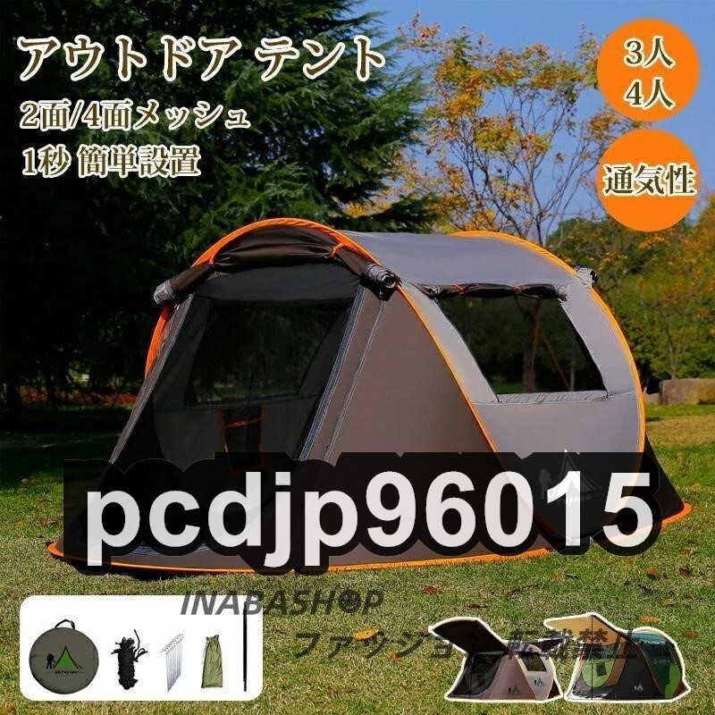 - アウトドア テント3-4人ワンタッチ テント ポップアップテント ダブルドア テント キャンプ 通気性ファミリーキャンプ ベランピング 虫よけ