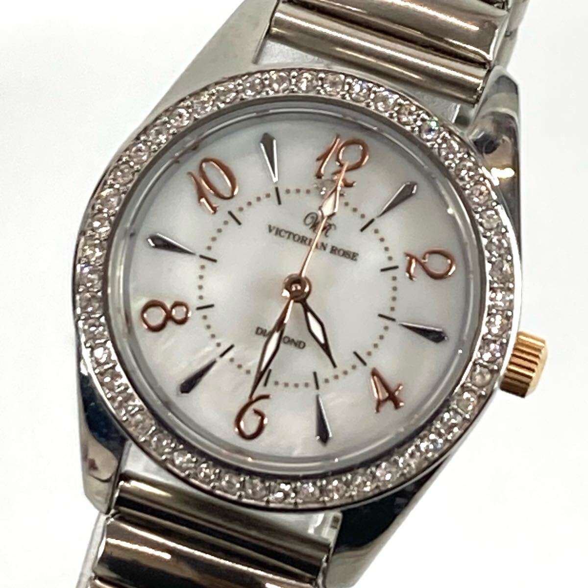 - ヴィクトリアンローズ ソーラーウォッチ 1P天然ダイヤ ベゼル スワロフスキー クリスタル シェル文字盤 蛇腹ベルト レディース 宝飾腕時計
