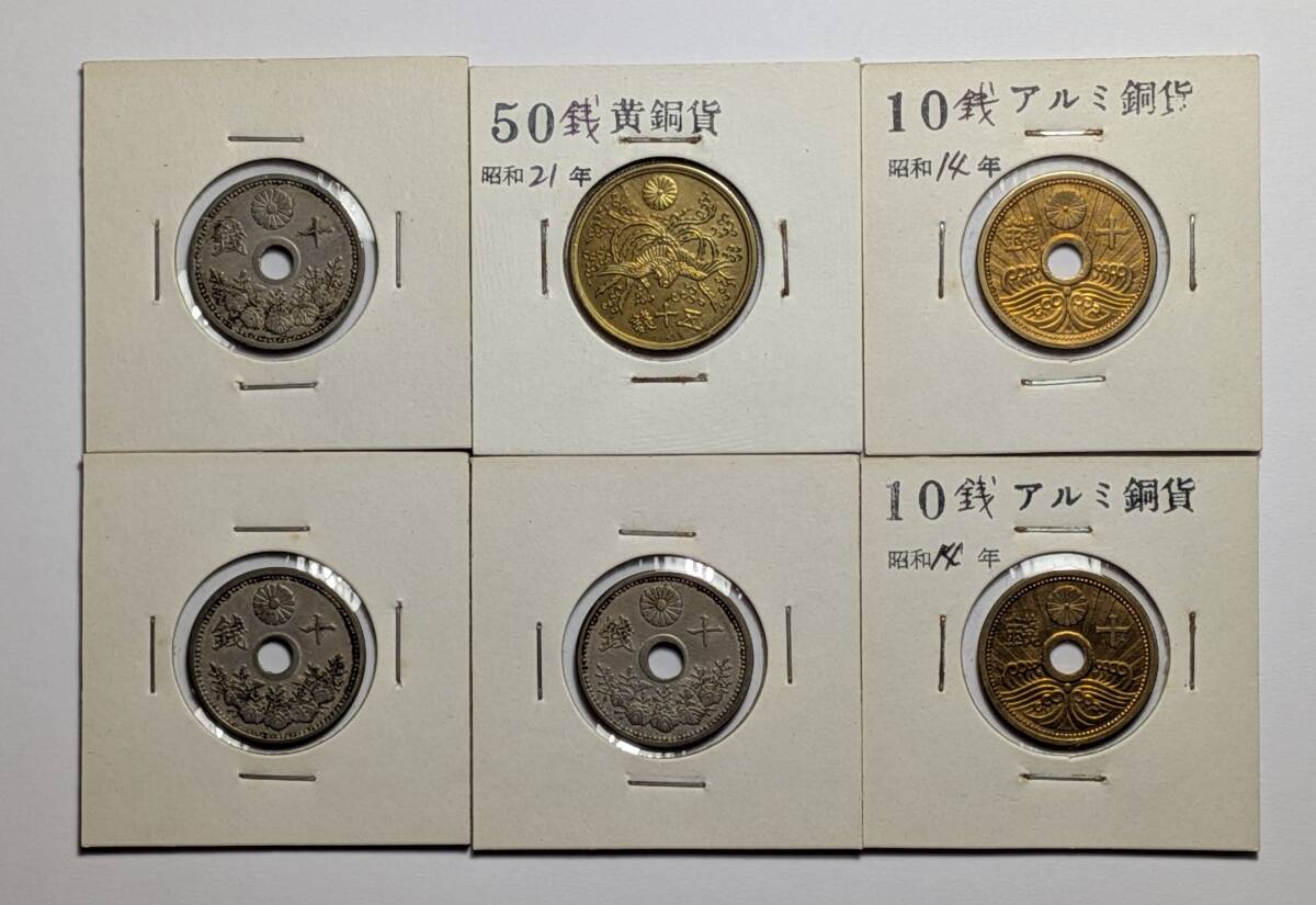 - ■6枚セット=10銭白銅貨3枚(大正11年2+12年1)+10銭アルミ銅貨2枚(昭和14年)+50銭黄銅貨1枚(S21年)■美品 硬貨 貨幣 紙幣 古銭 コイン 穴銭