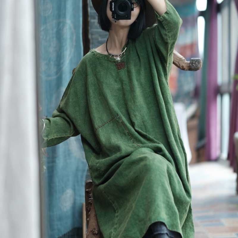 - 新入荷推薦ロングワンピース 刺 刺し子 アンティーク風 洋服ミックス ロマンファッション ポップ 楽ちん 麻 リネン 色落ち グリーン