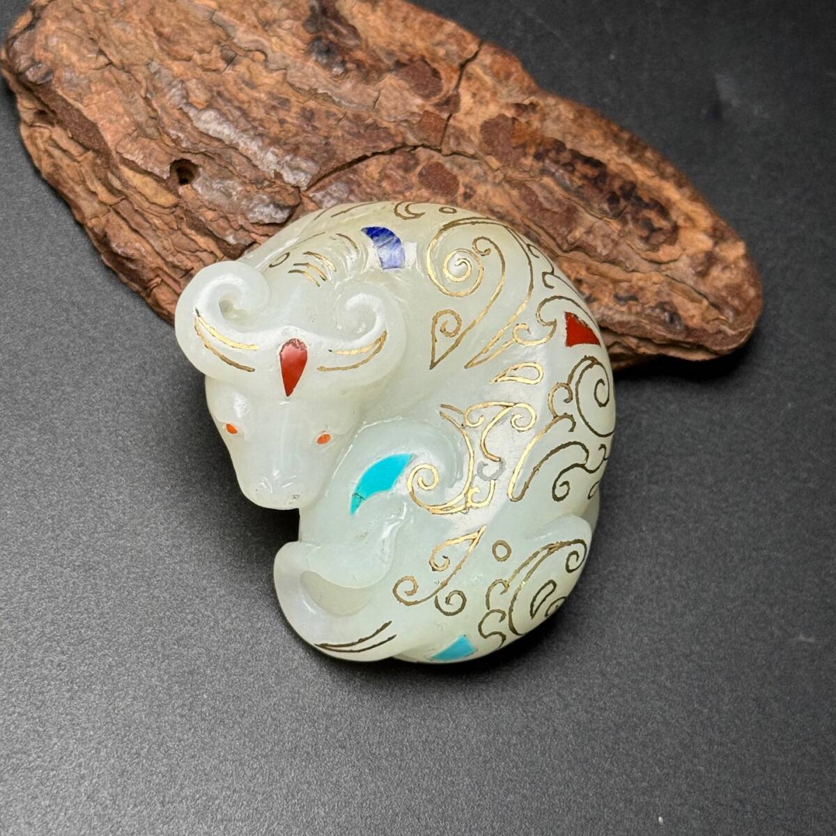- ▽鴻▽ 和田玉製 細密彫 玉牛 置物 賞物 古賞物 中国古玩 中国古美術