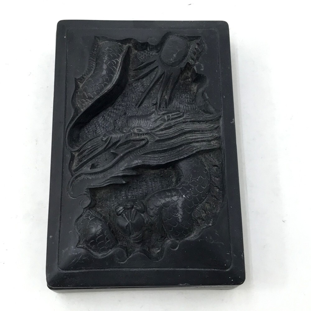 - 【同梱不可】【60】書道 硯 すずり 龍 辰 蓋つき 内部朱色の墨汁あと有り 約11.7×18×2.7cm 約1.89kg 詳細不明