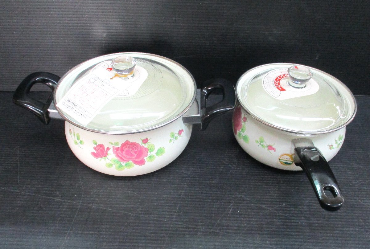 > ★ 100290 ホーロー鍋『 ピンクローズ 』2個セット サンコーウェアー レトロ φ30x奥行19x高さ9.5cm 長期保管の汚れ有 未使用 ★