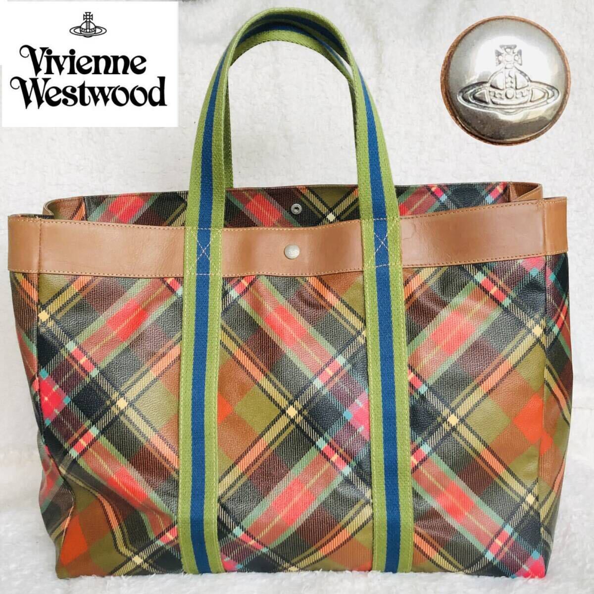 - ビビアン Vivienne Westwood 大容量バッグ 肩掛け タータンチェック オーヴ トートバッグ 旅行バッグ オーブ 裏地オーブ柄 本革 レザー