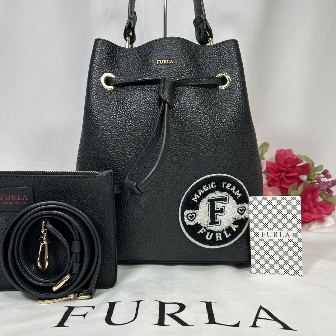 - 【極美品】FURLA フルラ ステイシー 巾着 2way ショルダーバッグ ハンドバッグ マジックチーム レザー 斜め掛け ブラック 黒 レディース