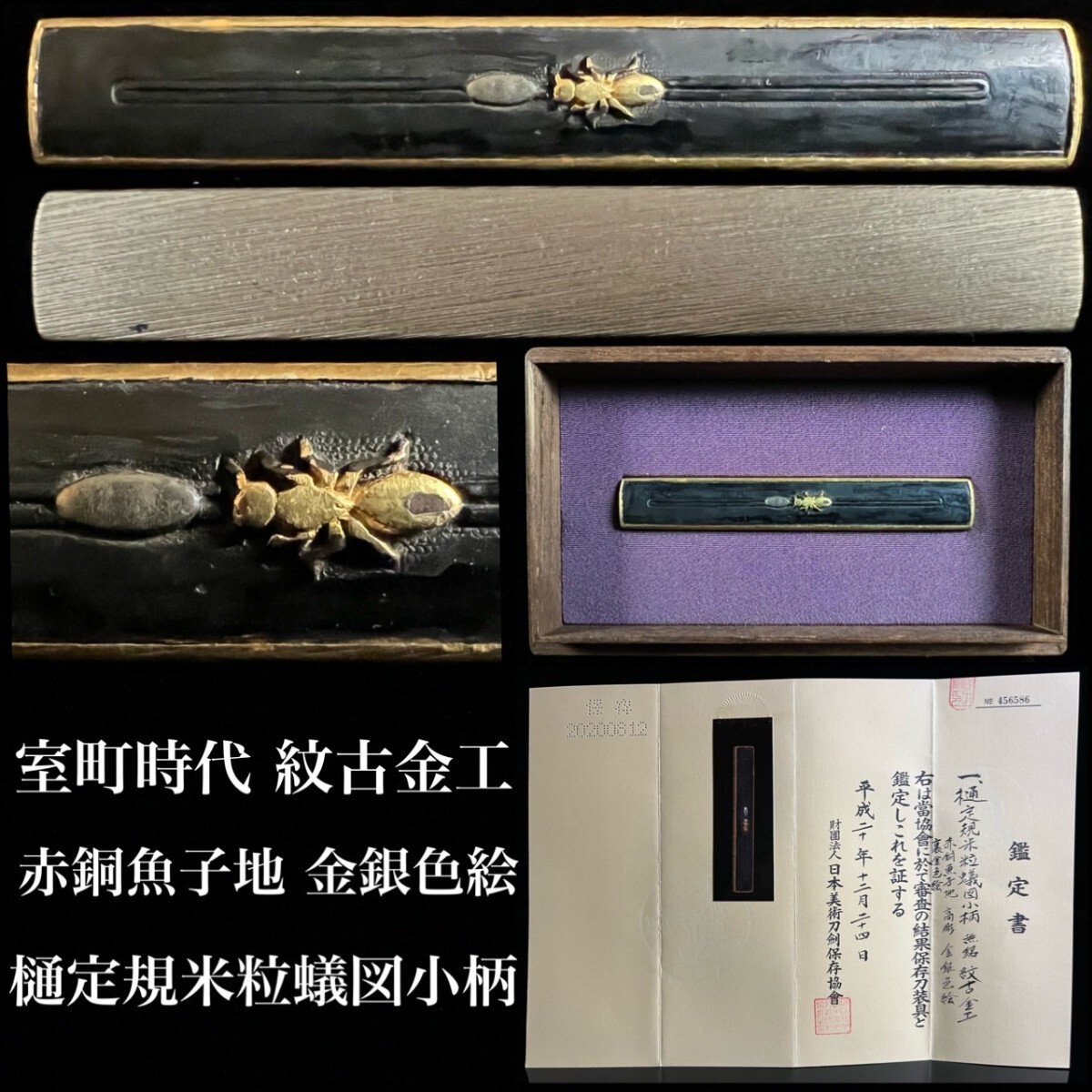 > ◇鸛◇ 刀剣美術 室町時代 紋古金工 無銘 赤銅魚子地 樋定規米粒蟻図小柄 9.7cm 30g 専用箱付 保存刀装具鑑定書 鍔 目貫 武具骨董