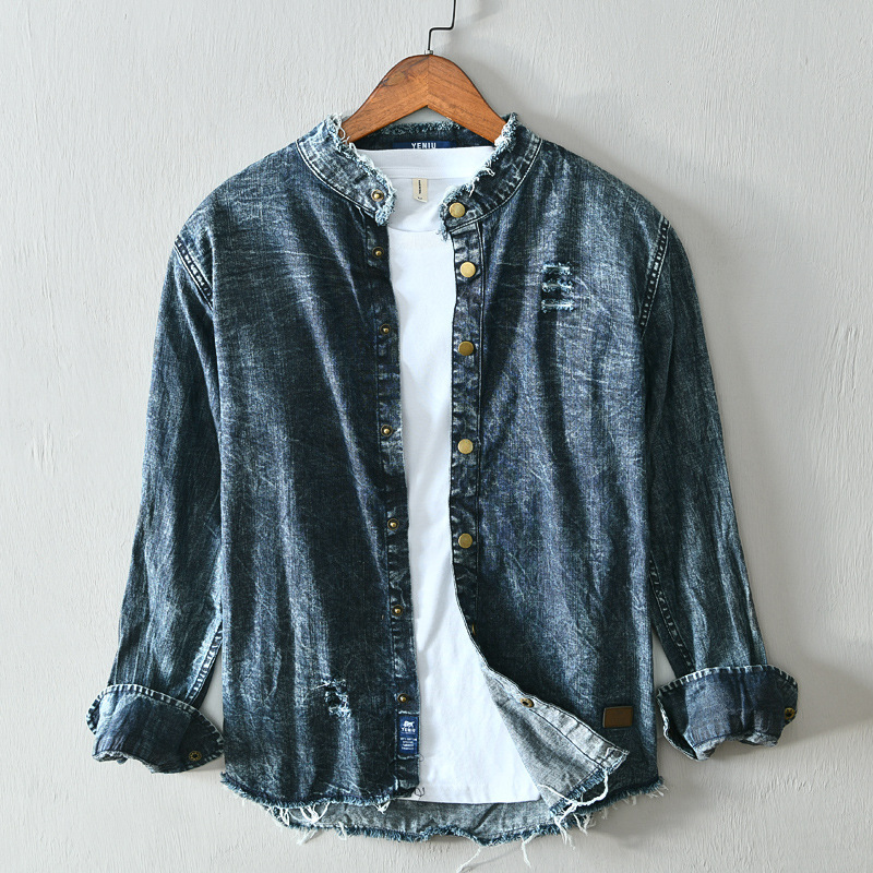 - 新作デニムシャツ メンズ カジュアルシャツ 立ち襟 長袖 ヴィンテージ加工 アメカジ トップス ダークブルー 2XL2色