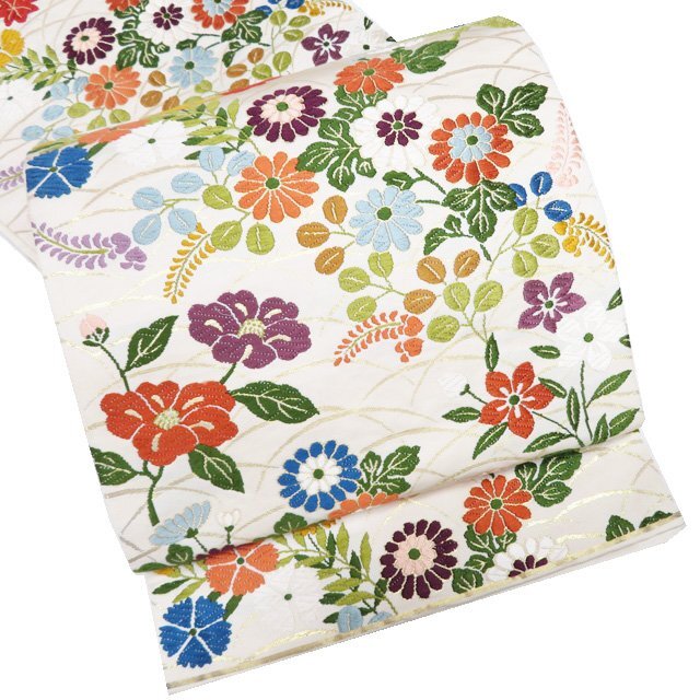 - 袋帯 中古 リサイクル 正絹 フォーマル 仕立て上がり 六通 唐織 芝草に花模様 秋草 箔糸 生成色 多色 金 きもの北條 A1190-12