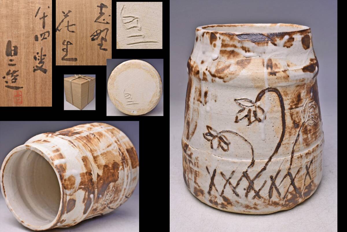 > 高橋白二 ★ 志野花生 ★ 共箱 ★ 北大路魯山人 に薫陶受ける ★ 激しい景色 良し ★ 花入れ 壺