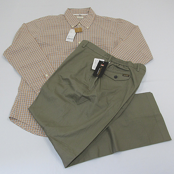 > ユニクロ ブロードチェックシャツ XL+ポールミラー ストレッチパンツ LL オリーブ系/タグ付き未使用2点まとめて パンツやや難あり