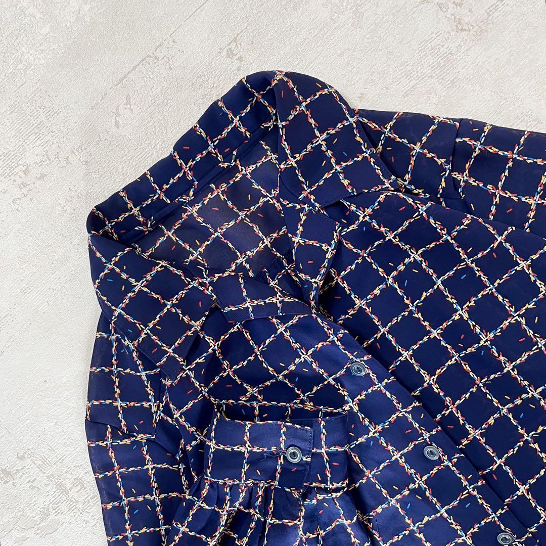 - 昭和レトロチェック柄長袖ブラウスオープンカラーネイビー透け素材af