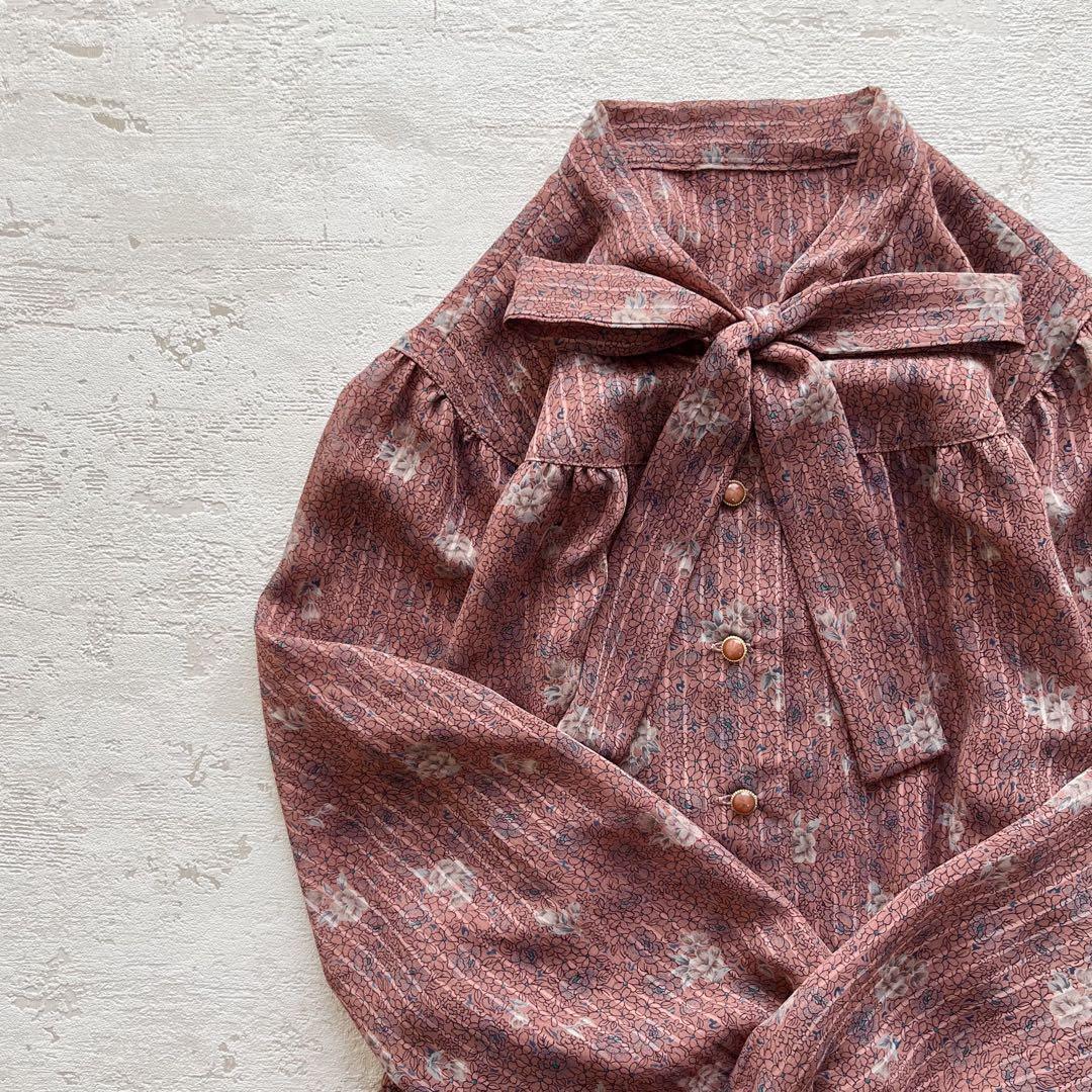 - 昭和レトロ花柄長袖ロングワンピースリボン付き透け素材ピンクフリーサイズaf