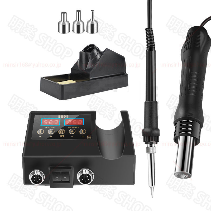・熱風と熱鉄2in1のリワークステーション・低騒音と省スペースのデザイン・ダブル LCD ディスプレイが搭載され、正確の温度を表示する・マイクロコンピューターが制御し、急速に温度上昇できる・PID技術は温度の安定性を増えられる・知能的にセルフチェツク機能付き、操作安全・温度は70℃以下になると、回転は自動的に停止・ハンドルをセンシングスイッチで装備し、ハンドルを握ったり置いたりすると自動的に作業モードまたはスタンバイモードに入る・システムの自動冷気機能は発熱体を保護し、寿命を延ばせられる・半田ごてのESD設計は感知装置を保護できる・国際基準の加熱器で、使用と交換も便利・高品質の?气抵抗、長持ち・熱風溶接機を置くブラスチックハンドルラック・金属製のハンドルラックは鉄を燃えやすい部品より遠ざける・熱収縮、乾燥、塗装除去、解凍、予熱、粘着、はんだなどに適用