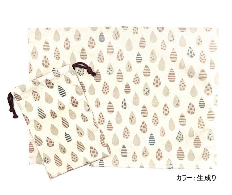 - 給食袋(巾着袋MS)+ナフキン(長方形) 2点セット【北欧風 ドロップ しずく柄 生成り】ランチョンマット コップ袋 はし袋 箸袋 ポーチ 雫