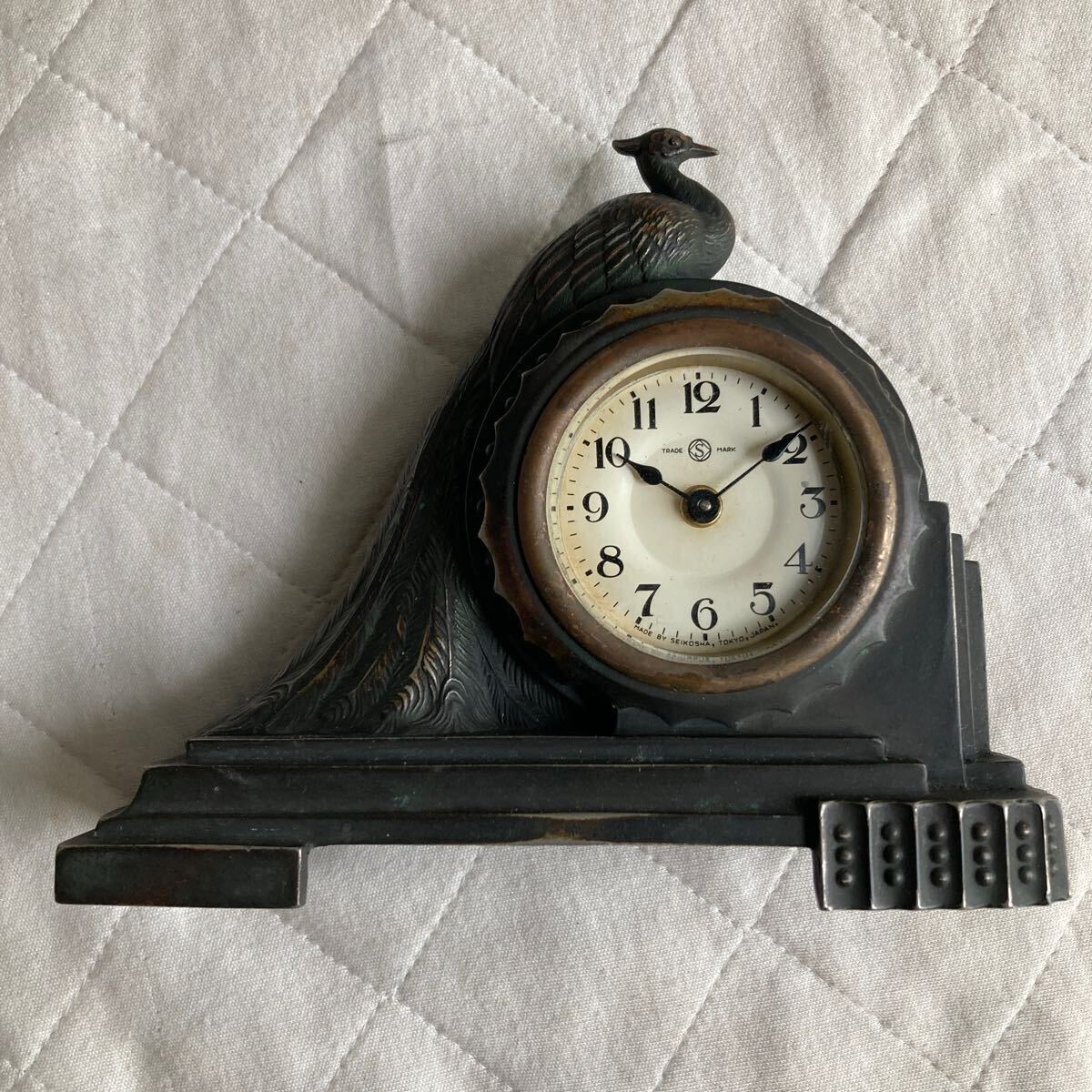 - 大正.昭和時代初期頃. レトロな孔雀象嵌入りの置時計. ゼンマイ式.精工舎製.材質は銅.真鍮製全て純正.稼働品.完品です.重さ.約1kgです.