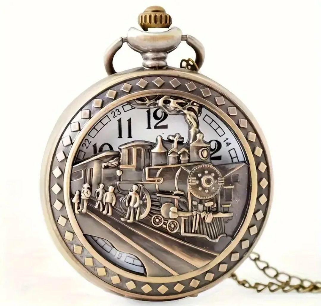 - ヴィンテージブロンズ蒸気機関車3D彫刻クォーツ懐中時計