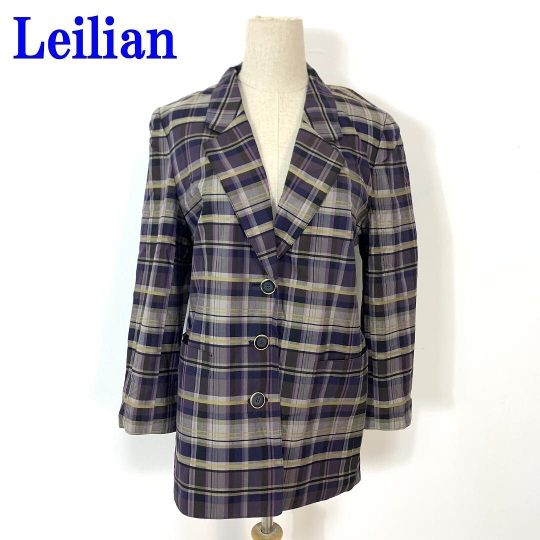 - レリアン テーラードジャケット ネイビーLeilian チェック柄 薄手 パープル 綿100% 9 C2883