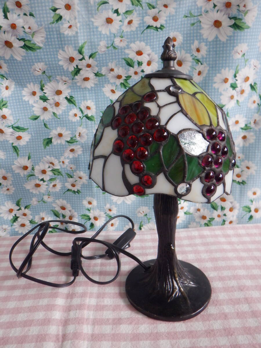 - E6『赤い葡萄柄のステンドグラスの卓上ライト 照明器具 100V白熱灯25W 通電OK! レトロ調~高さ約30cm』~長期保管品