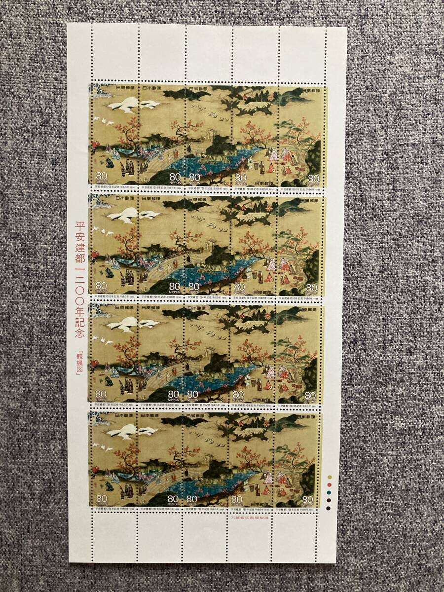 - ★未使用 平安建都 1200年記念 観楓図 京都 1994年 平成6年 切手シート 5種連刷 80円 20枚 日本郵便