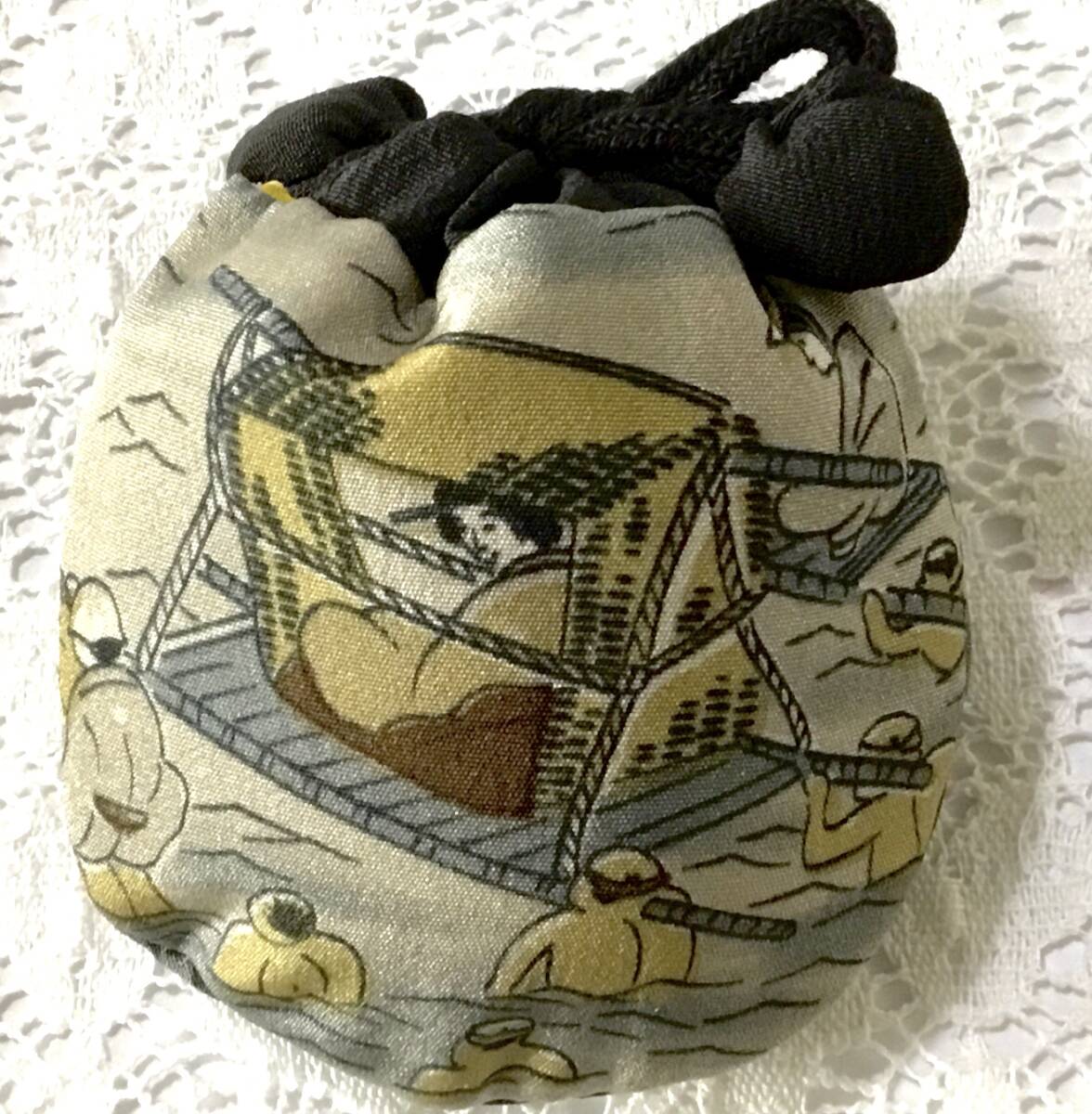 - 古布762 ソフト小袋・絹( 浮世絵風 河渡し 橋越え・僅か柄)時代着物地
