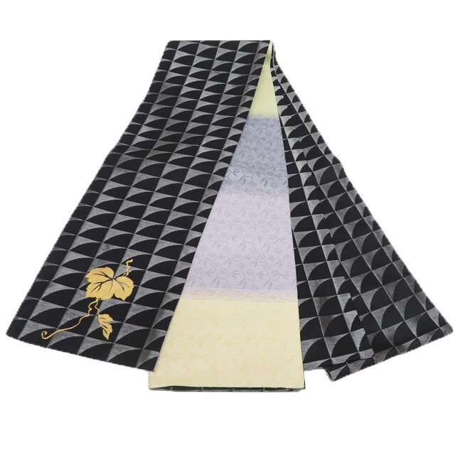- 半幅帯 中古 リサイクル 正絹 カジュアル 仕立て上がり 全通 幾何学模様 蔦の図 銀糸 黒色 きもの北條 A1195-11