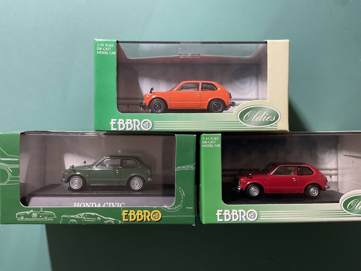 > EBBRO (エブロ) 1/43 HONDA CIVIC (シビック) 三種 43123 ハイデラックス グリーン + 43296 GL1972 レッド + 43443 RS 1974 オレンジ