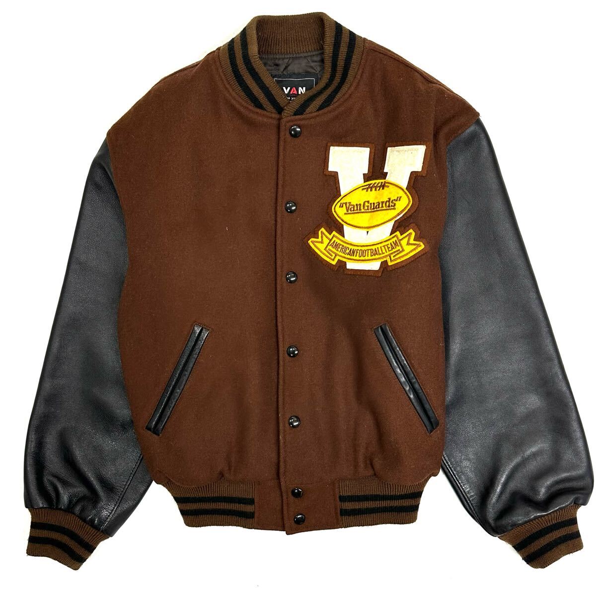 > 良品!!90's VAN JAC ウール 牛革 レザー アーチロゴ 中綿入り スタジャン(M)ブラウン×ブラック メンズ ブルゾン 当時物 ヴァンヂャケット