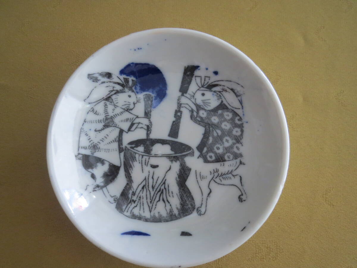 - 印版 皿 餅つき兎 藍の月 うさぎ 手塩皿 大正期