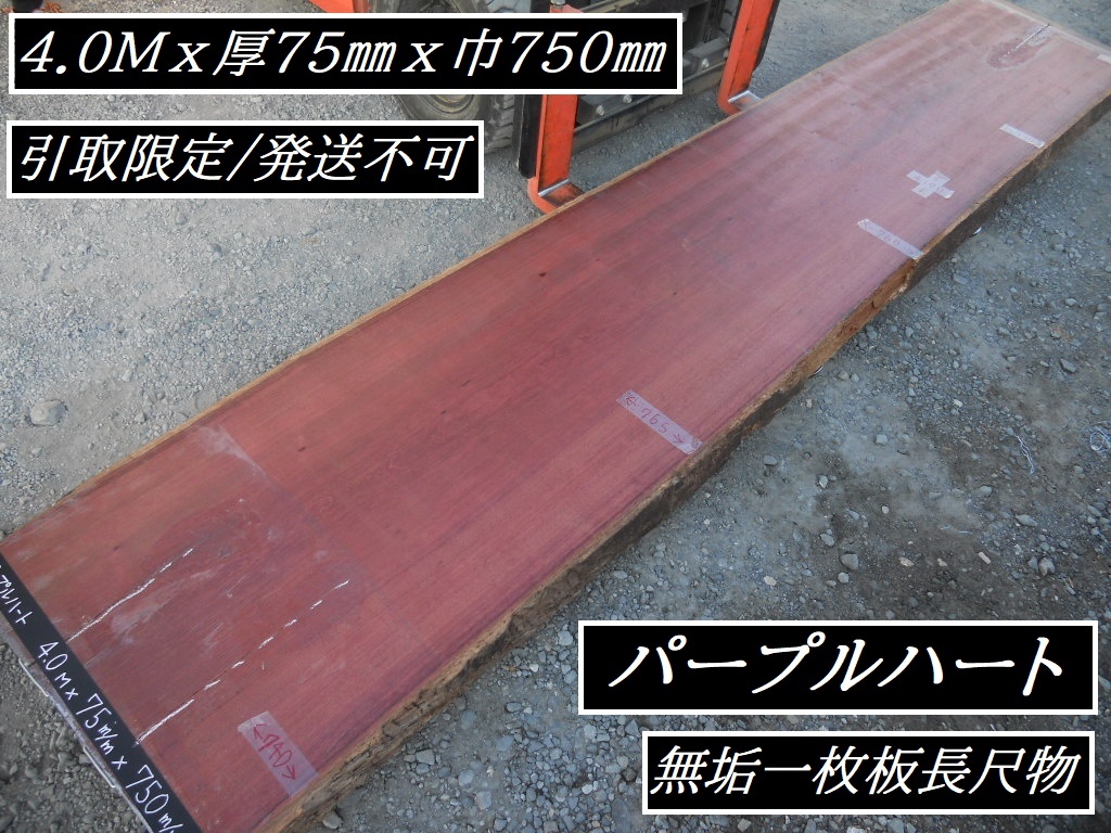 - 引取 パープルハート 長410cmX79~83cmX7.5cm 無垢一枚板 ロングテーブル素材 カウンター材料 紫色 広葉樹 長尺 広葉樹 耳付き 天然木 木材