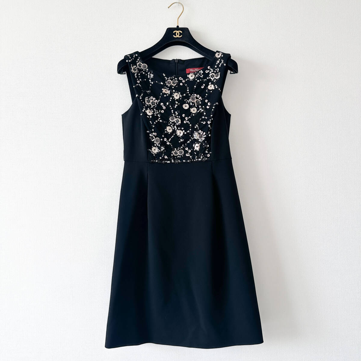 - 【美品】MaxMara STUDIO (マックスマーラ ストゥーディオ) / ビジュー刺繍 ドレス ワンピース 黒 ブラック 結婚式 パーティー