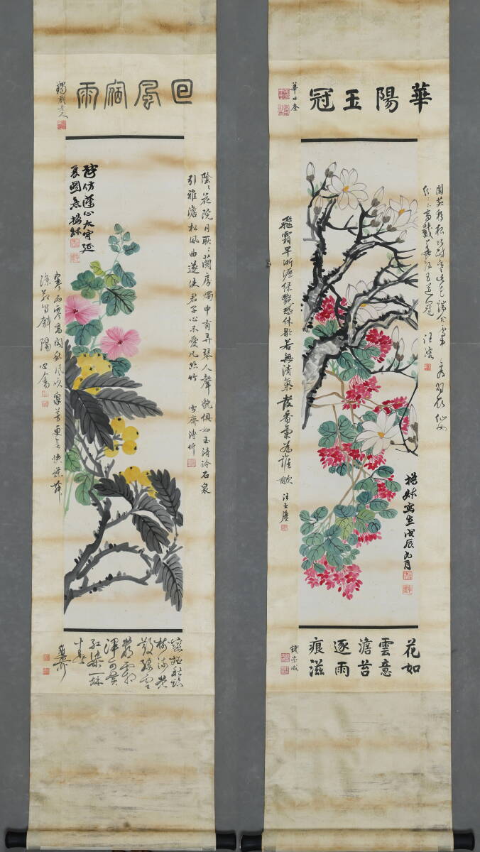- 古美術 掛け軸 中国・近現代 「趙之謙書」 紙本 【花卉図 二幅】 立軸 書道 巻き物 肉筆保証 唐物 古画 画心108x27cm LT-2505145