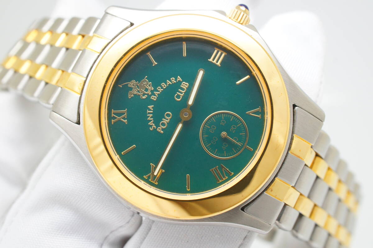 > E114●作動良好 SANTA BARBARA サンタバーバラ POLO CLUB ポロクラブ 緑文字盤 スモセコ メンズ腕時計 コンビ お洒落 クォーツ