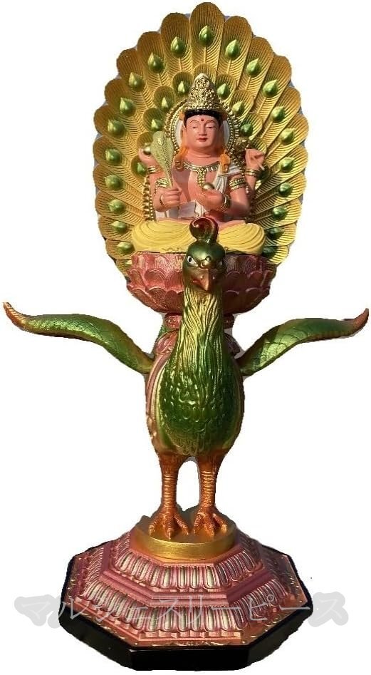 - 仏像【明王】孔雀明王 座像 乗座孔雀 桧木彩色 乗座孔雀菩薩 高級木彫り 祈る 厄除け 尾羽光背孔雀台 高さ36CM