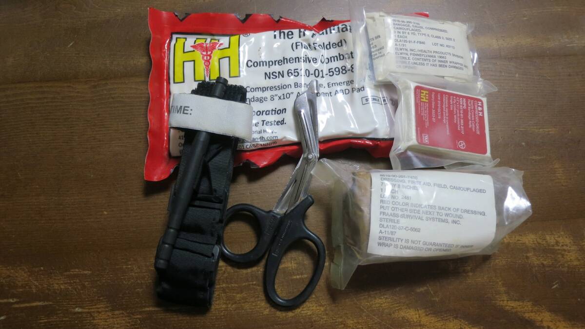 > 米軍放出品 実物 FIRST AID (圧縮包帯、ガーゼ)止血帯、ハサミ 6点セツト D-189