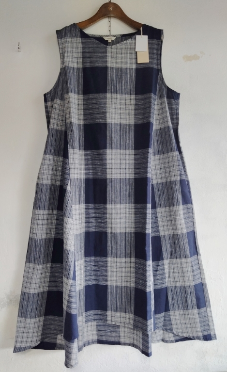 > 未使用(¥5,990)【studio CLIP スタジオクリップ】[L] 洗える 綿麻チェックVネックノースリーブワンピ サーキュラーロングワンピ 紺 送350