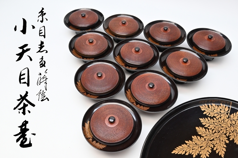 - 天目茶台 ■ 見事な 糸目忍蒔絵 小天目茶台 十客 ■ 天然木 天目台 時代漆器 茶道具 布 木箱入り ■